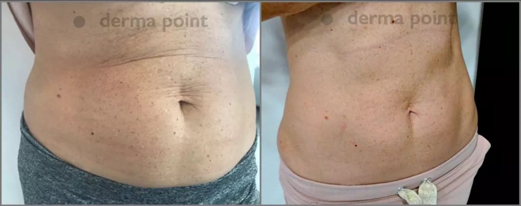 Pacjentka zgłosiła się do gabinetu derma point, gdyż po trzech ciążach borykała się z nadmiarem tkanki tłuszczowej w obrębie brzucha i osłabieniem mięśni brzucha. Wykonano 1 zabieg kriolipolizy, następnie po 4 tygodniach wykonano serię 4 zabiegów EM BODY.